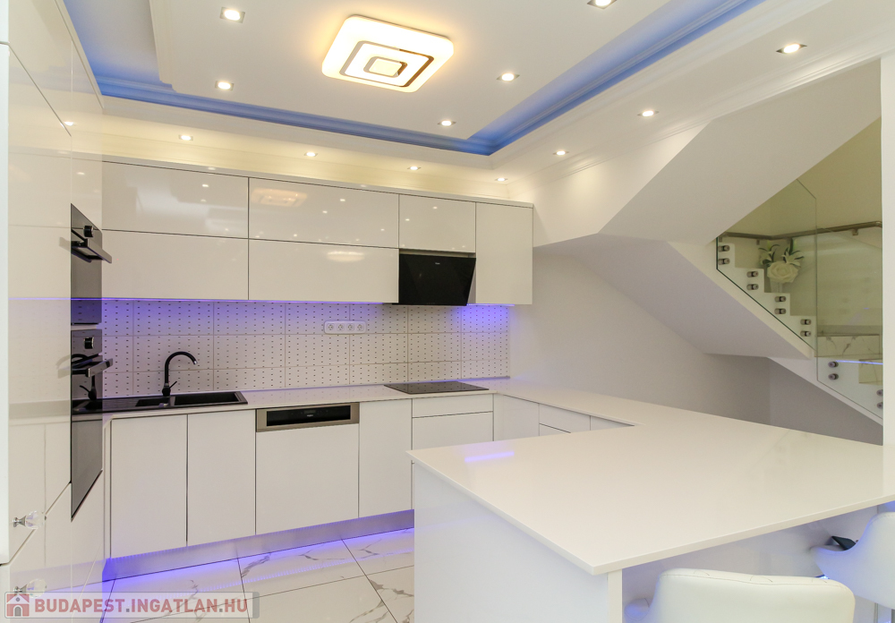 Rögtön szembetűnik a minőségi anyaghasználat a hidegburkolatoktól kezdve, az épített konyhán át, a lépcsőház edzett üvegkorlátjáig és még sorolhatnám. A modern belső teret, mely tágas és világos, a letisztultság jellemzi, megfűszerezve a beépített mennyezetvilágítás adta hangulattal. Az olasz designbútorok csak tovább emelnek azon az érzésen, hogy jó itt lenni. Az emeleten elhelyezkedő négy hálóhelyiség hotelszobák kényelmével vetekszik. Mindegyik teljesen berendezett, tévével, légkondicionálóval felszerelt és kapcsolódik hozzá egy kisebb, vagy nagyobb erkély. Ablakos Wellis fürdőszobái is tovább fokozzák a kényelmet. A helyiségek pontos elrendezését, méreteit szintenkénti alaprajzokon szemléltetem.