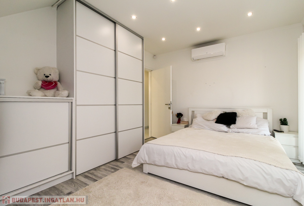 Fűtés-Hűtés, Árnyékolás, Biztonságtechnika: Ariston kondenzációs kazán – földszinten padlófűtés, emeleten radiátoros hőleadással. 5db légkondicionáló, redőnyözött nyílászárók. Kamerás beléptetőrendszer – kódos, kártyás bejutással, riasztó. Elektromosan mozgatható gépkocsi és garázskapu. Kültéri gömbkamerás megfigyelőrendszer.