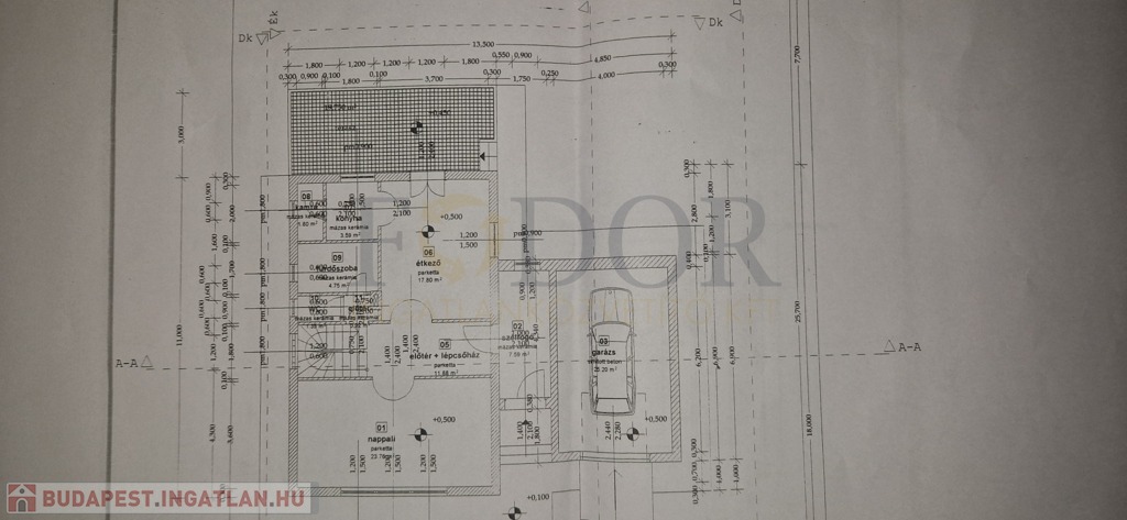 Földszint: Előszoba, Amerikai-konyhás nappali, kamra, fürdő (zuhanyzó)+ wc + bide, garázs, terasz.