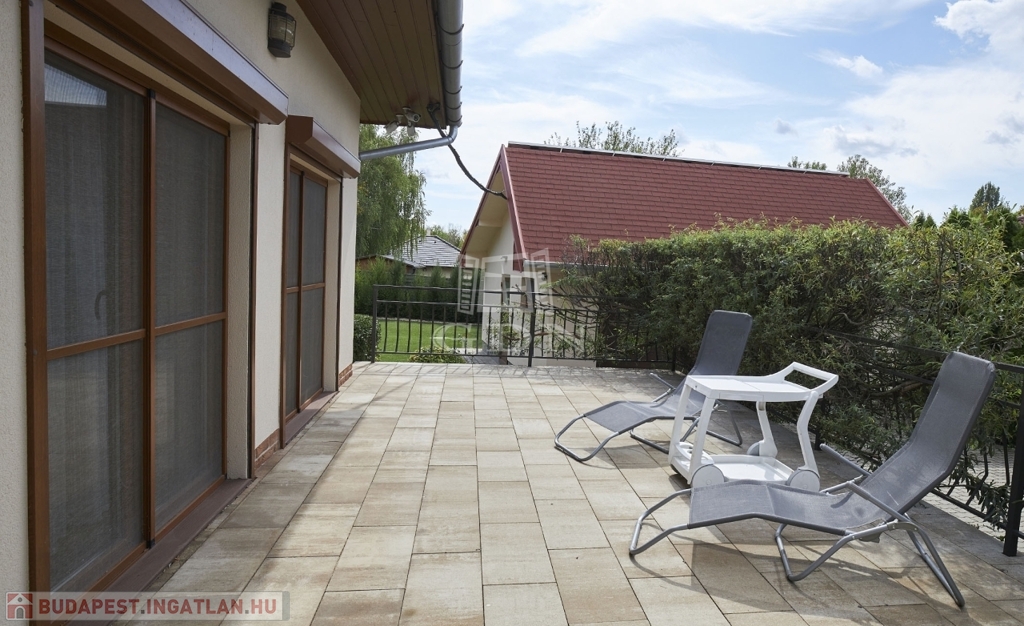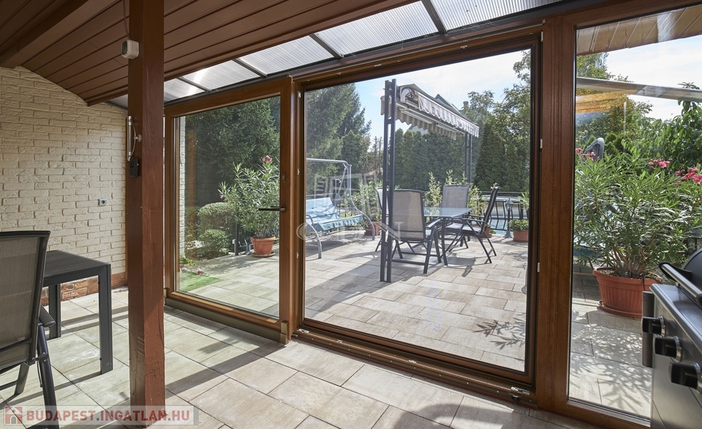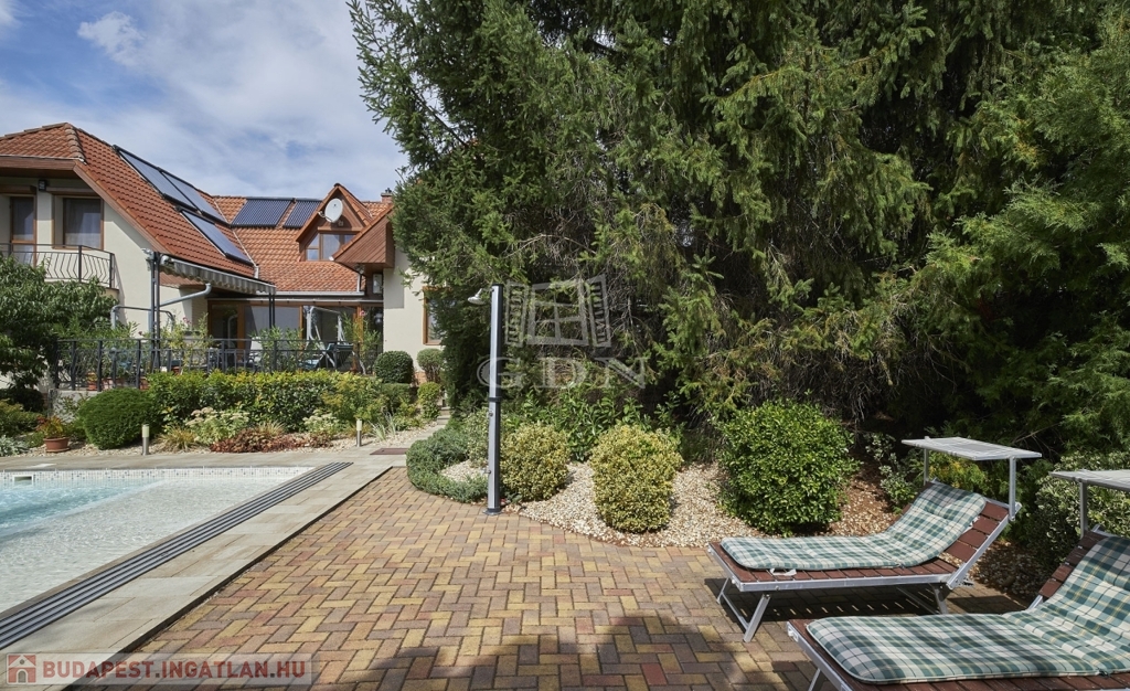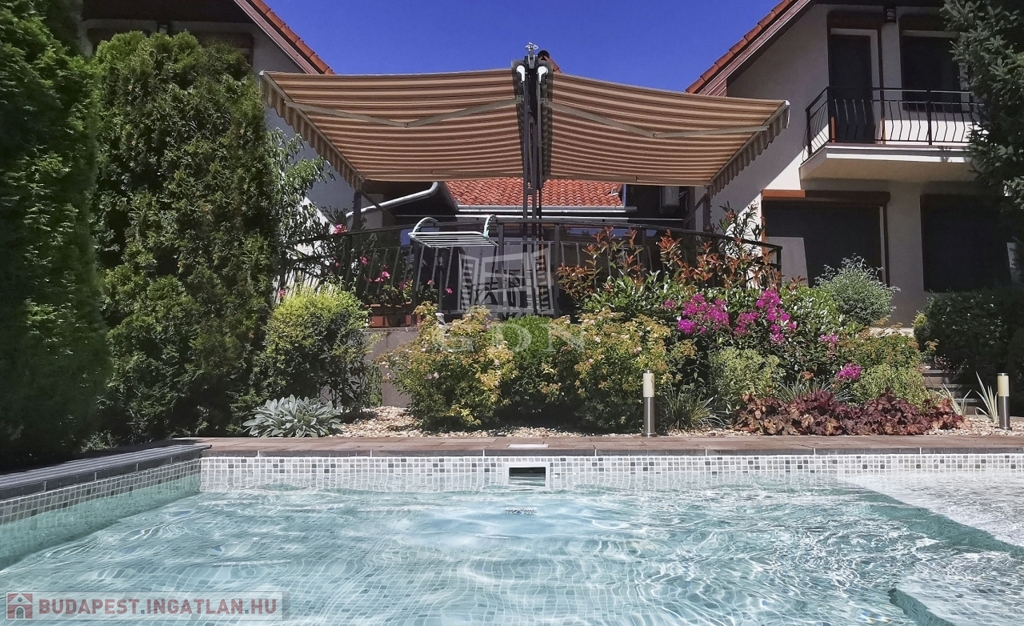 Kertben öntöző rendszer telepített, örökzöld növényekkel parkosított, melyben egy fedett, fűthető úszómedence található.