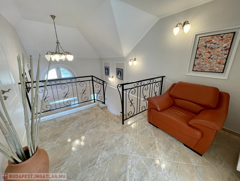 a lépcsőházból feljutva a második szinten: Galéria 8,35 (7,53) m2, kazán 2,30 (1,28) m2, gardrób 5,32 (2,65) m2, lakó előtér (nappali) 27,61 m2, erkély 11,92 m2, szoba 14,26 (8,07) m2, fürdőszoba + WC 6,90 m2, szoba 14,26 (8,07) m2, közlekedő 3,15 m2, erkély 4 m2 lett kialakítva.