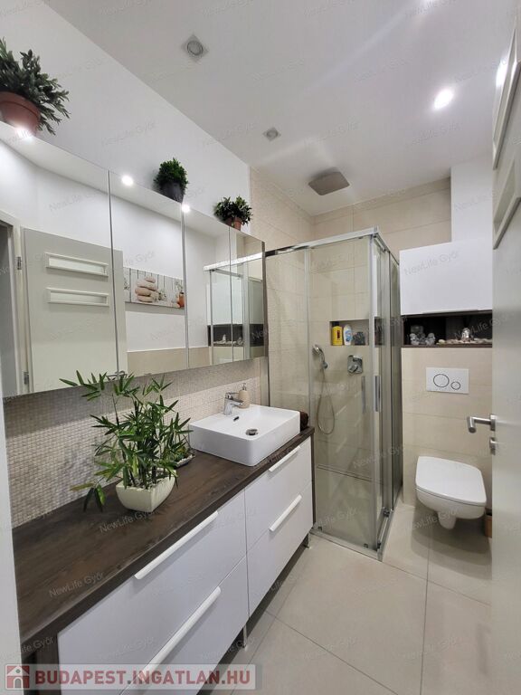 - Két fürdőszoba – az alsó zuhanyzós, a felső kádas, dupla mosdóval