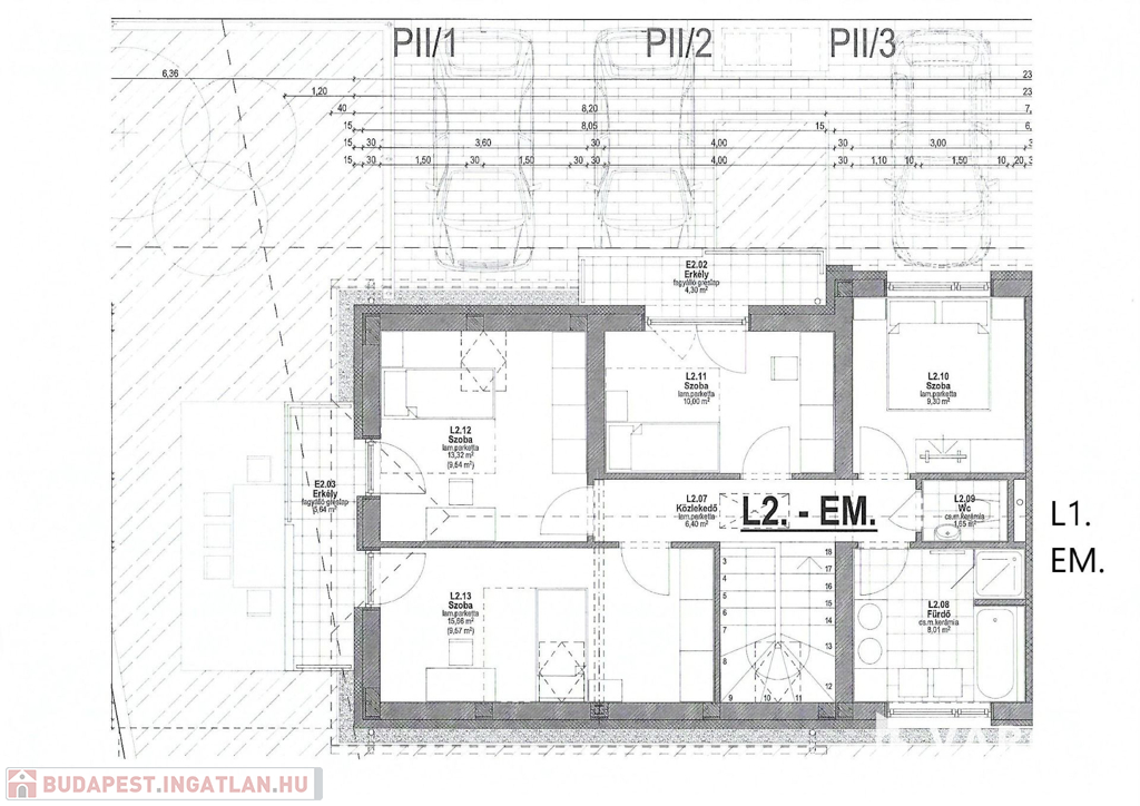 4 db hálószoba, fürdőszoba (dupla mosdó-zuhanyzó-fürdőkád), külön wc helyiség, közlekedő és 2 db erkély került kialakításra (mely 3 szobához kapcsolódik).