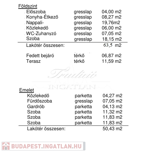 Az emelet területe összesen br. 58,73 m2, amely következő helyiségekből áll: szoba br. 15,98 m2, br. szoba 15,98 m2, szoba 11,32 m2, gardrób 4,13 m2, fürdőszoba 07,05 m2, közlekedő 4,27 m2.