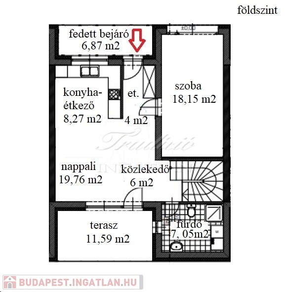 A földszint 63,5 m2, melyhez 6,87 m2-es fedett bejáró illetve 11,59 m2-es terasz is kapcsolódik. Praktikusan itt egy nagyméretű szobát is kialakítottak, ami sorházi lakásoknál ritkaságnak számít.