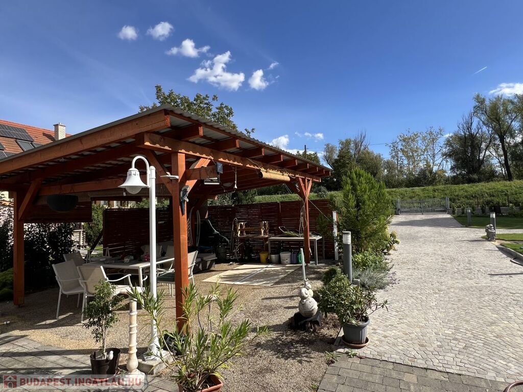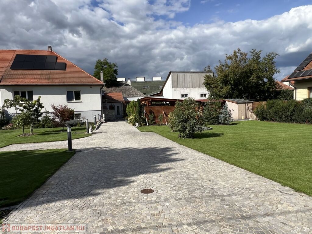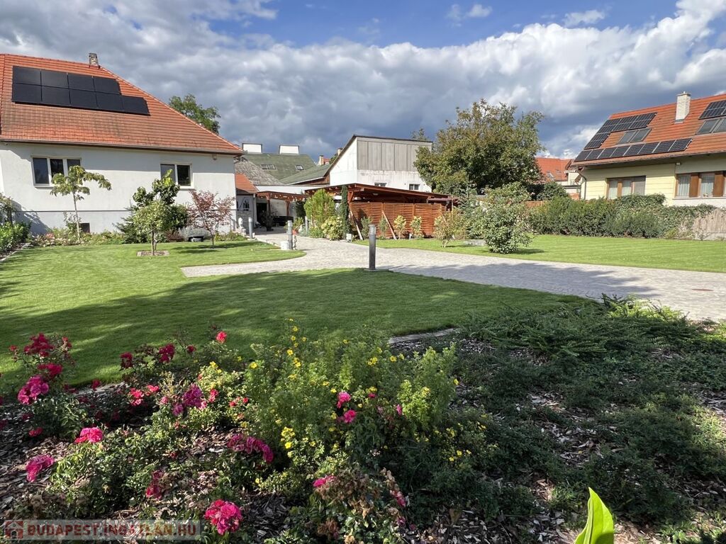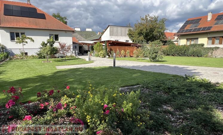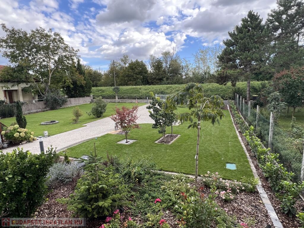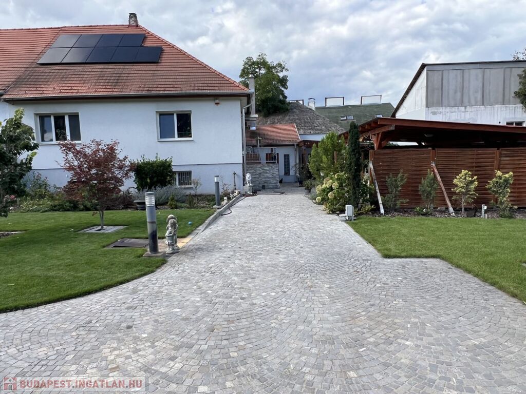 A 852 m2-es telek parkosított, automata öntözőrendszerrel, robot fűnyíróval ellátott, prémium anyagok felhasználásával, magas műszaki minőségben megépített térköves közlekedő részekkel rendelkezik gyalogos és autóforgalom részére egyaránt.
