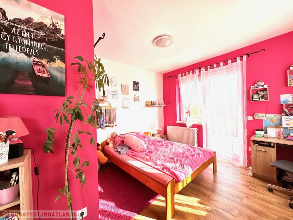 A földszinti lakószint:- nappali és konyha étkező, valamint szülői háló, gardrób és fürdőszoba teszi teljessé a magánszférát!! Az emelet a gyerekek birodalma!
