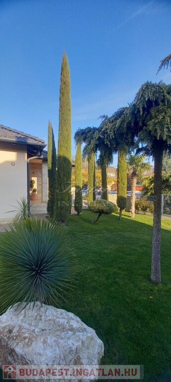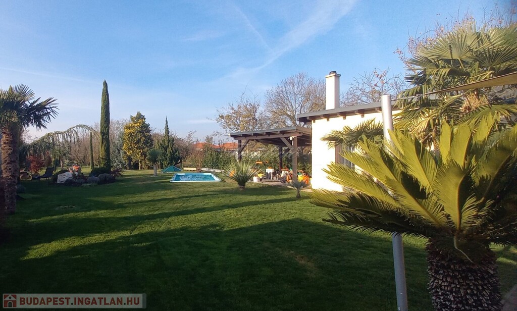 Az 1830 m2-es gyönyörűen karbantartott, parkosított, trópusi, mediterrán hangulatú telken a ház mellett egy medence, egy kazánház és egy fedett tároló is helyet kapott.