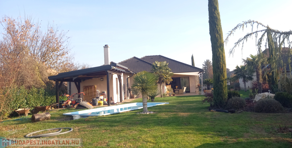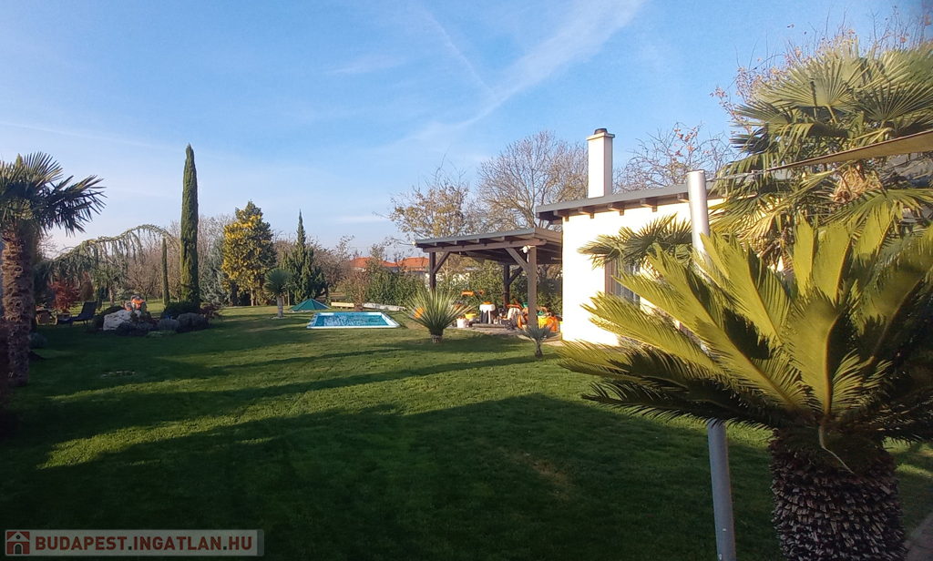 Az 1830 m2-es gyönyörűen karbantartott, parkosított, trópusi, mediterrán hangulatú telken a ház mellett egy medence, egy kazánház és egy fedett tároló is helyet kapott.