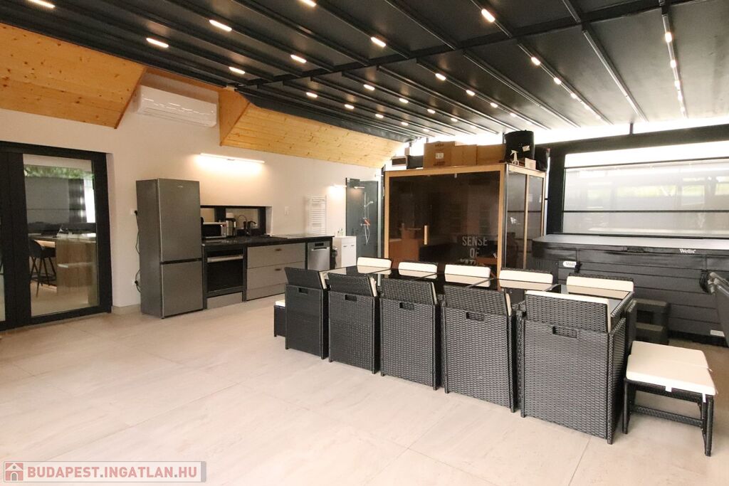 A ház szerves része egy 66,8 m2-es hatalmas, FEDETT, minden oldalról zárt TERASZ, melynek teteje és oldalablakai is elektromosan teljesen elhúzhatóak. Itt található a WELLNESS részleg egy 8 személyes SZAUNÁVAL, 6 személyes JAKUZZIVAL, melyhez zuhanyzós fürdőszoba is tartozik. Az óriási méret lehetővé teszi nagy társaságok vendégül látását is, melyhez külön konyha és 12 személyes kerti bútor áll rendelkezésre. 14 m2-es nyitott TERASZ.