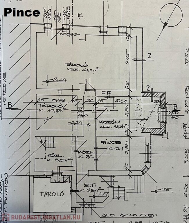 A 113 m2-es pince szinten jelenleg tágas tároló helyiségeken kívül a kazánház és a mosókonyha található. A szint belmagassága 200 cm. Így party helyiség, kondi terem, barkács műhely funkcióknak is tud helyet kínálni. A pince szint az udvar felől két irányból is megközelíthető.