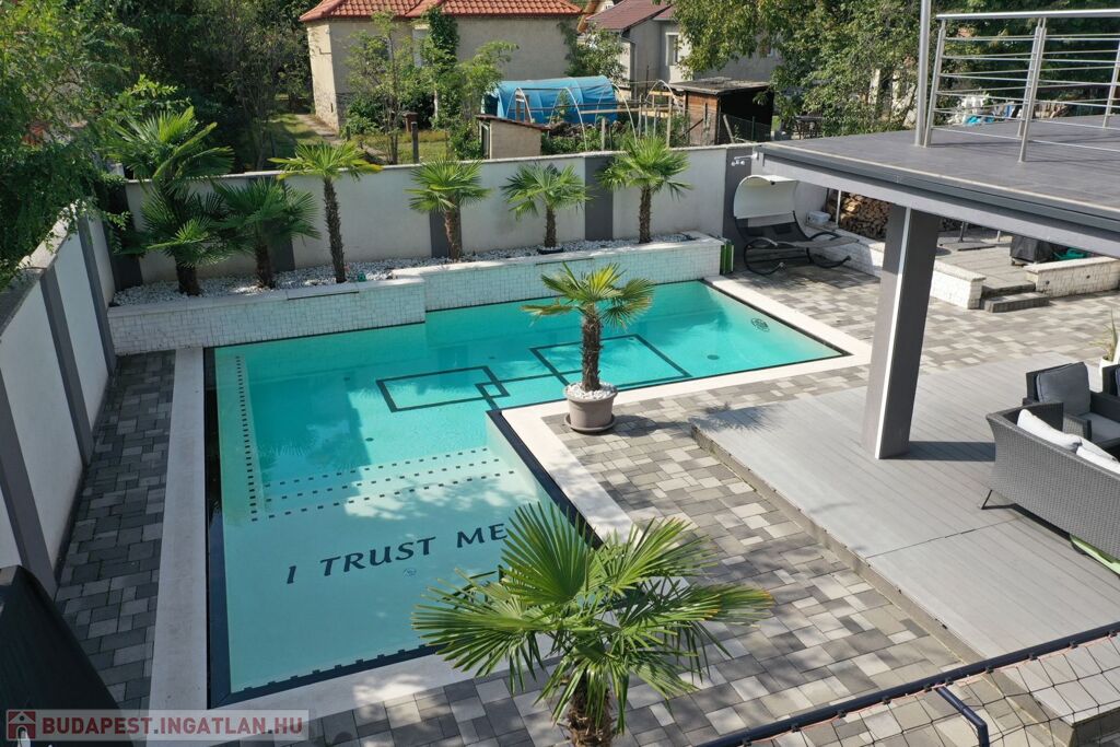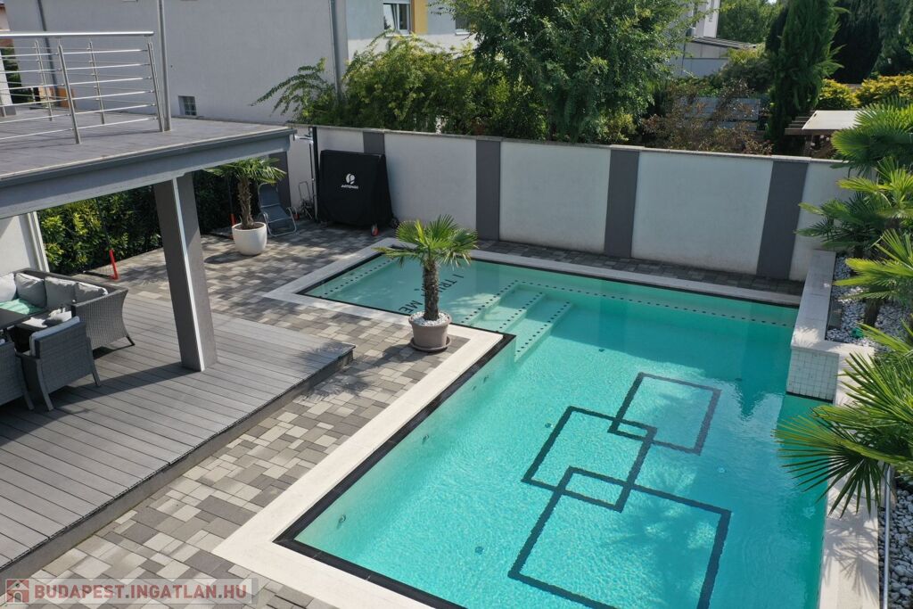 Az 540 m2-es telek, gépjármű és személy forgalom számára szánt felületei térkővel burkoltak. A telek többi részén füvesített terület és többnyire ízlésesen összeválogatott örökzöldek találhatóak. Ezek a növények kevés gondozást igényelnek, így több idő jut a feszített víztükrű, fűthető medence és a mellette található grill terasz élvezetére.