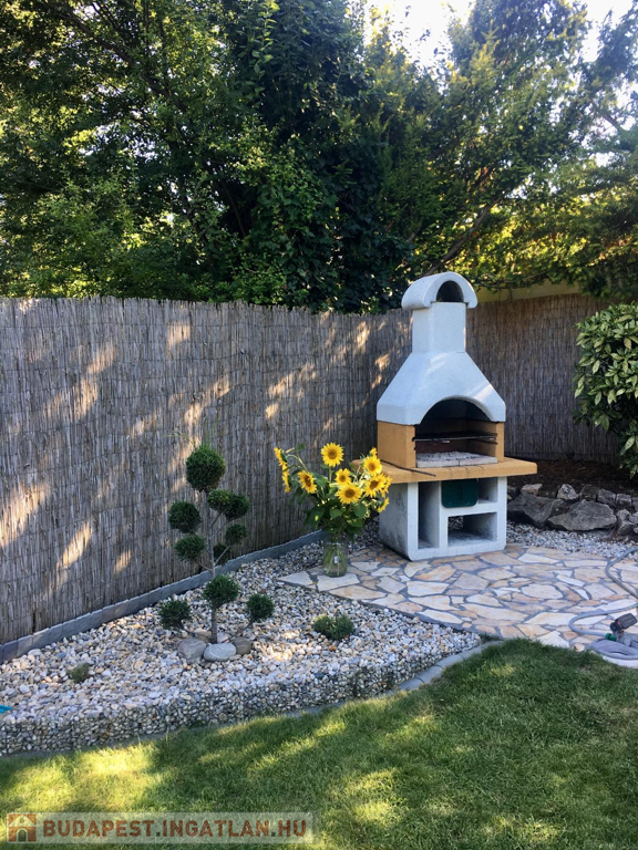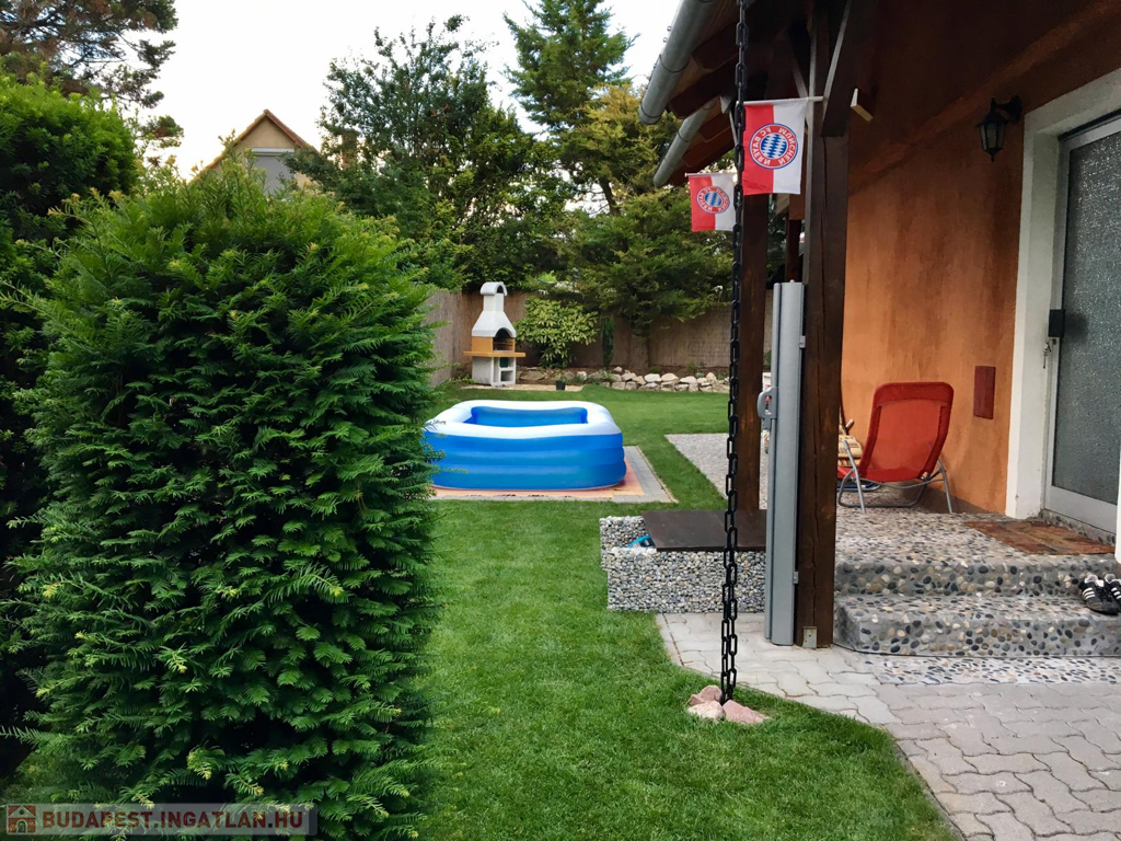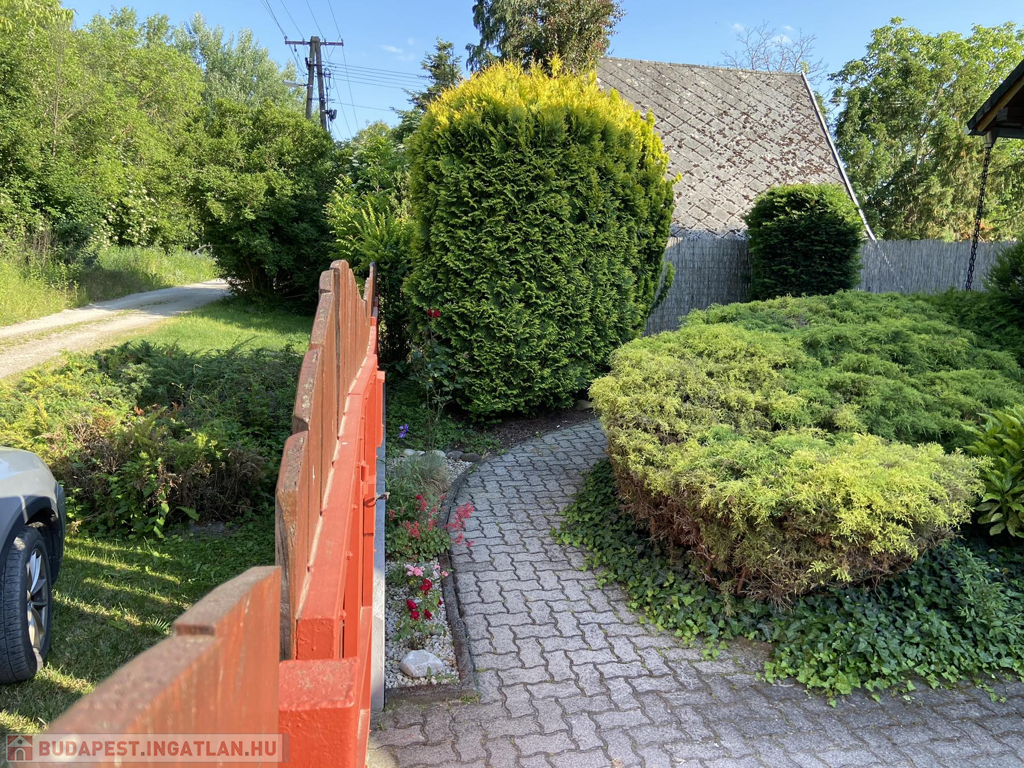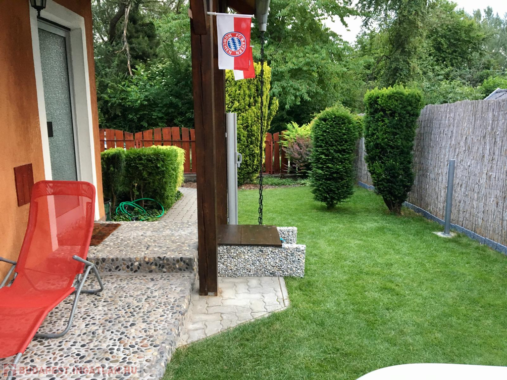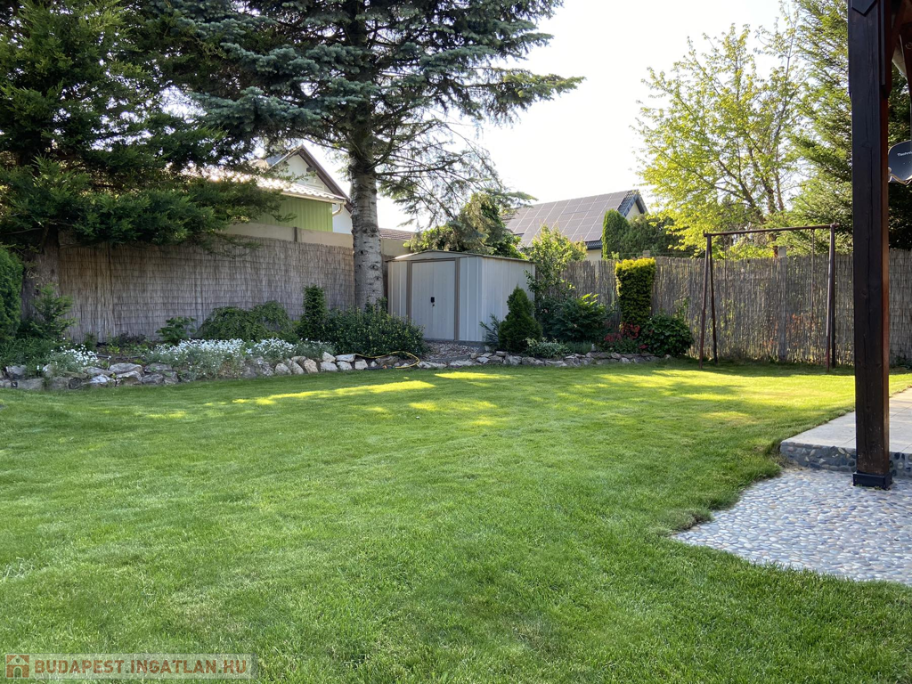 A gyönyörűen karbantartott, parkosított 311 m2-es, 40-50 éves fákkal, virágokkal, vakondhálóval, automata öntözőrendszerrel, robotfűnyíróval rendelkező telken a ház mellett egy 6 m2-es kerti tároló, grillező, valamint egy térkövezett rész is helyet kapott, ami ideális medence, vagy jakuzzi elhelyezése. A térkövezett gépkocsibeálló az előkertben található.