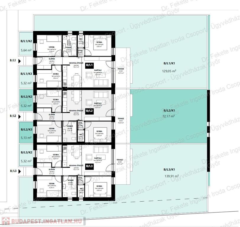 Minden lakás mérete megegyezik, csak a kert mérete változó.(Lásd alaprajzok)