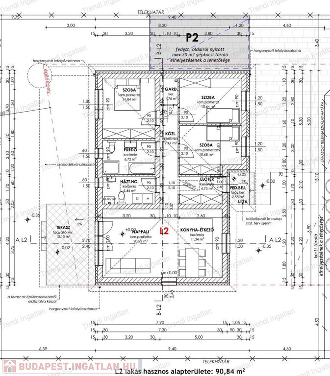 A remek elosztású házban amerikai konyhás nappali, 3 szoba, fürdőszoba, háztartási helyiség, előtér, gardrób, közlekedő található. A nappaliból 15,15 nm-es terasz nyílik.