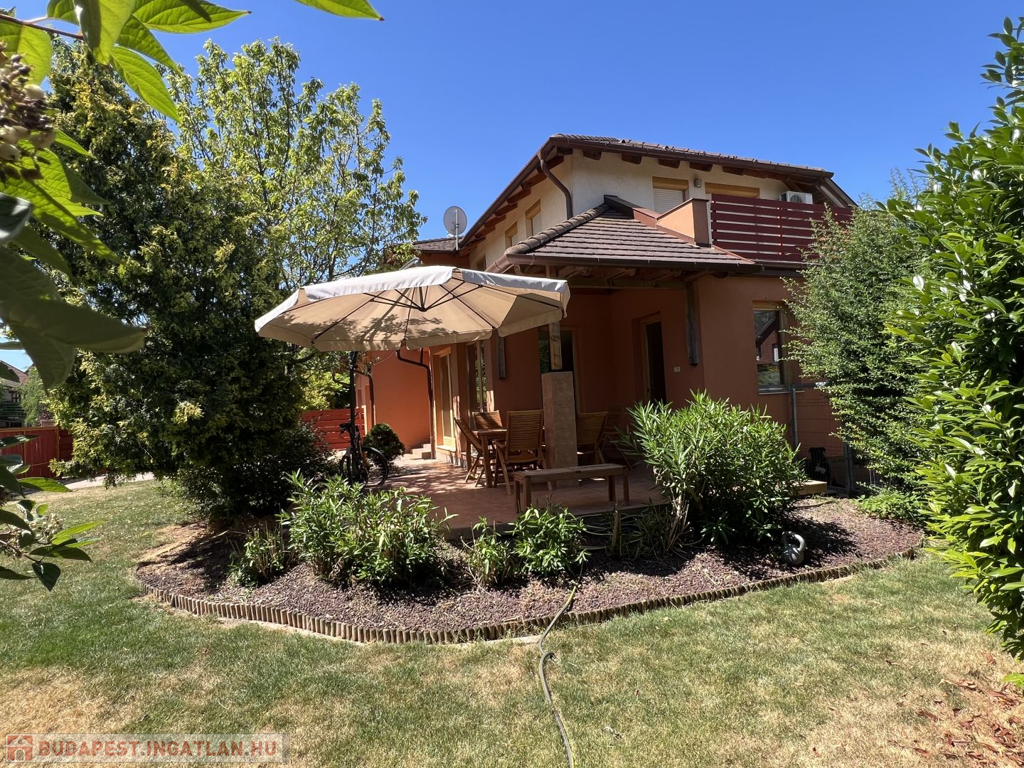 A 425 m2-es telek parkosított, automata öntözőrendszerrel ellátott, részben fedett terasszal és kialakult növényzettel szolgálja a tulajdonos és vendégei kényelmét.