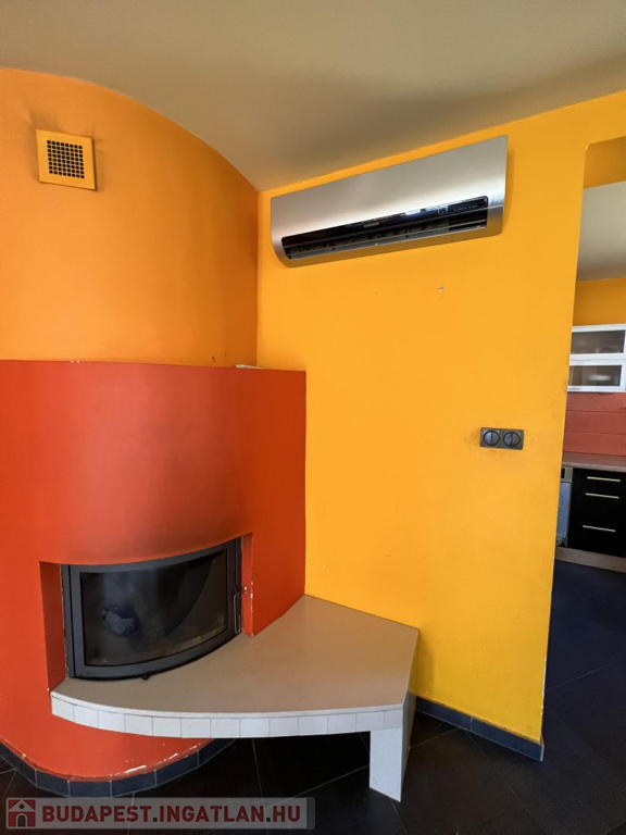 A nappaliban alternatív fűtési lehetőségként kiválóan működő kandalló található.
