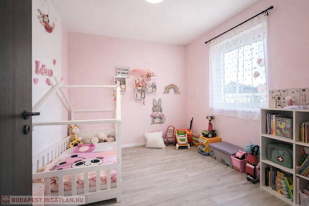 A kert hátsó részén egy kényelmes, jól kihasználható, biztonságos, zárt, füvesített saját kert van, ahol minden gyermekjáték, medence elhelyezhető.