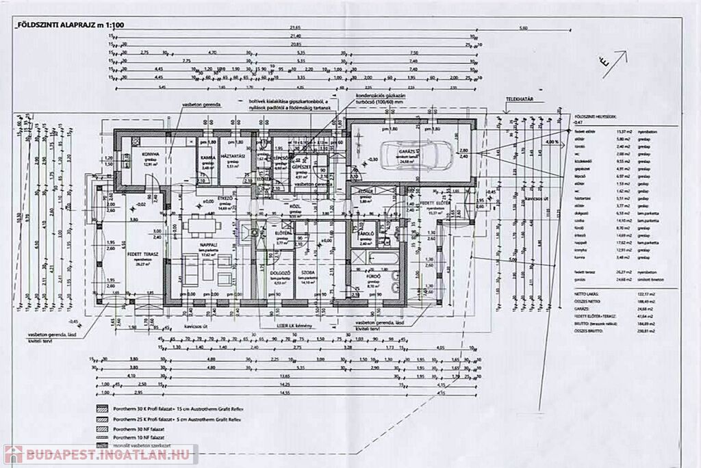 GARÁZS 24,68 m2, fedett TERASZ 26,27 m2, fedett bejárati terasz 15,37 m2.