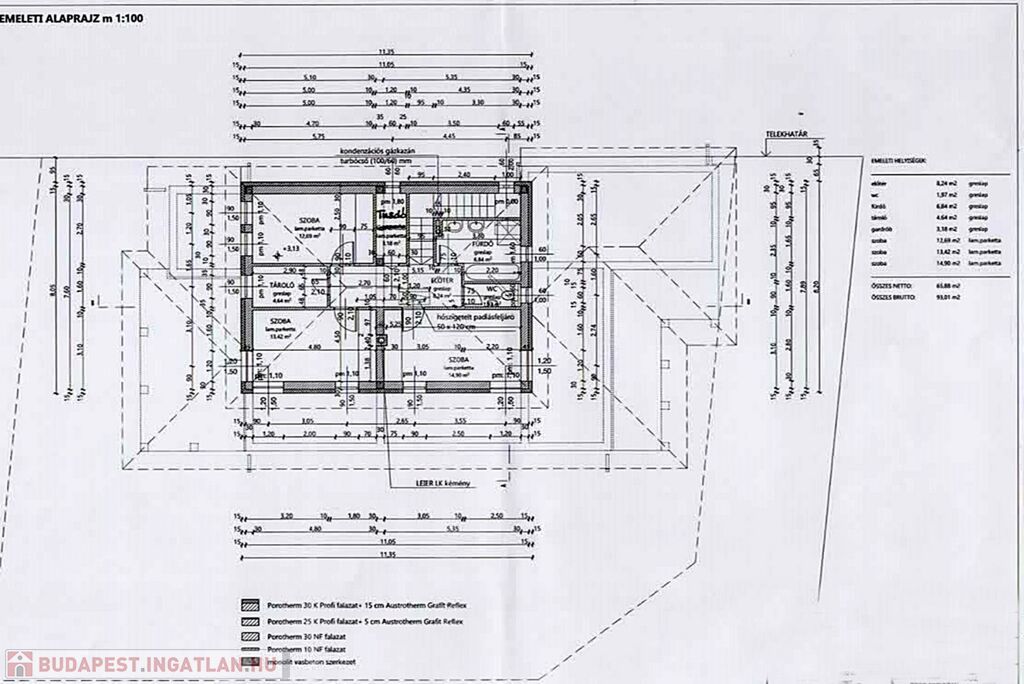 EMELET ( nettó 65,88 m2, bruttó 93,01 m2 ): 3 nagy hálószoba, 2 fürdőszoba, WC, gardrób, közlekedő, lépcső.