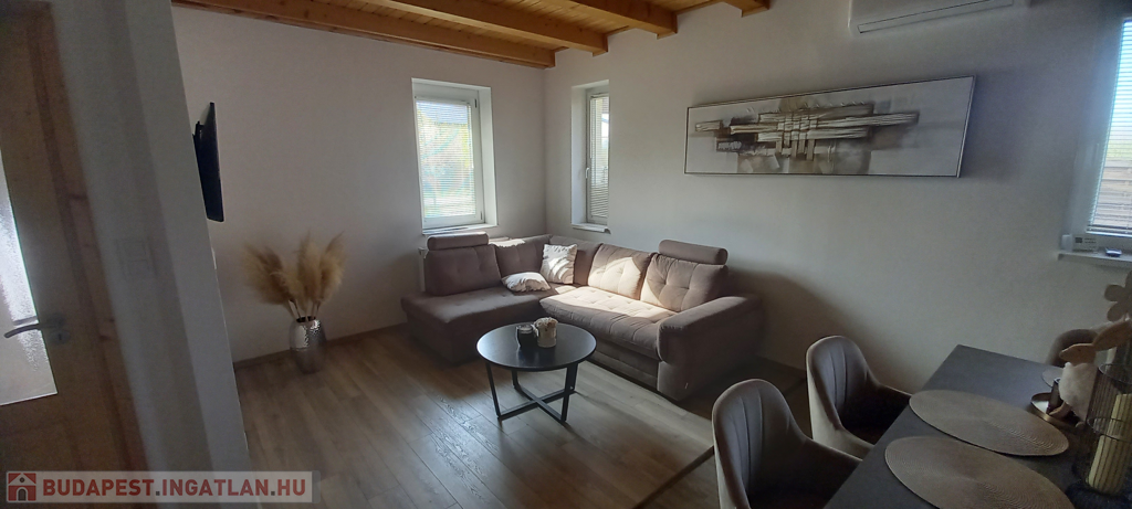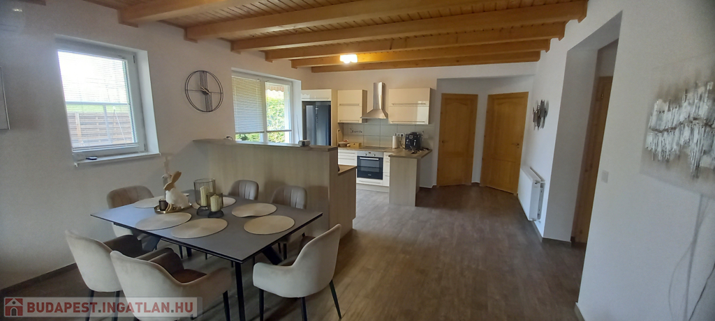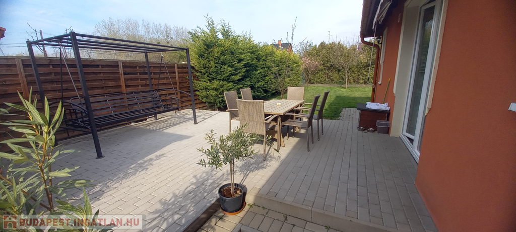 Az egy térben lévő nappali, étkező és az amerikai konyha tágas, világos teret eredményez. A 30 m2-es teraszra és az udvarra a konyhaszigettel is rendelkező konyhából tudunk kijutni. A szépen parkosított, térkövezett telken a családi ház mellett 2 db fából készült tároló, valamint egy kerti grillező is helyet kapott.