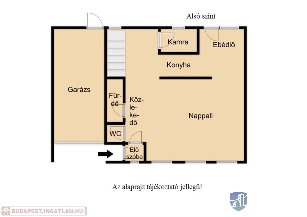 Az alsó szinten egy tágas nappali található, közlekedő, konyha, kamra, étkező, külön álló wc valamint fürdőszoba is.