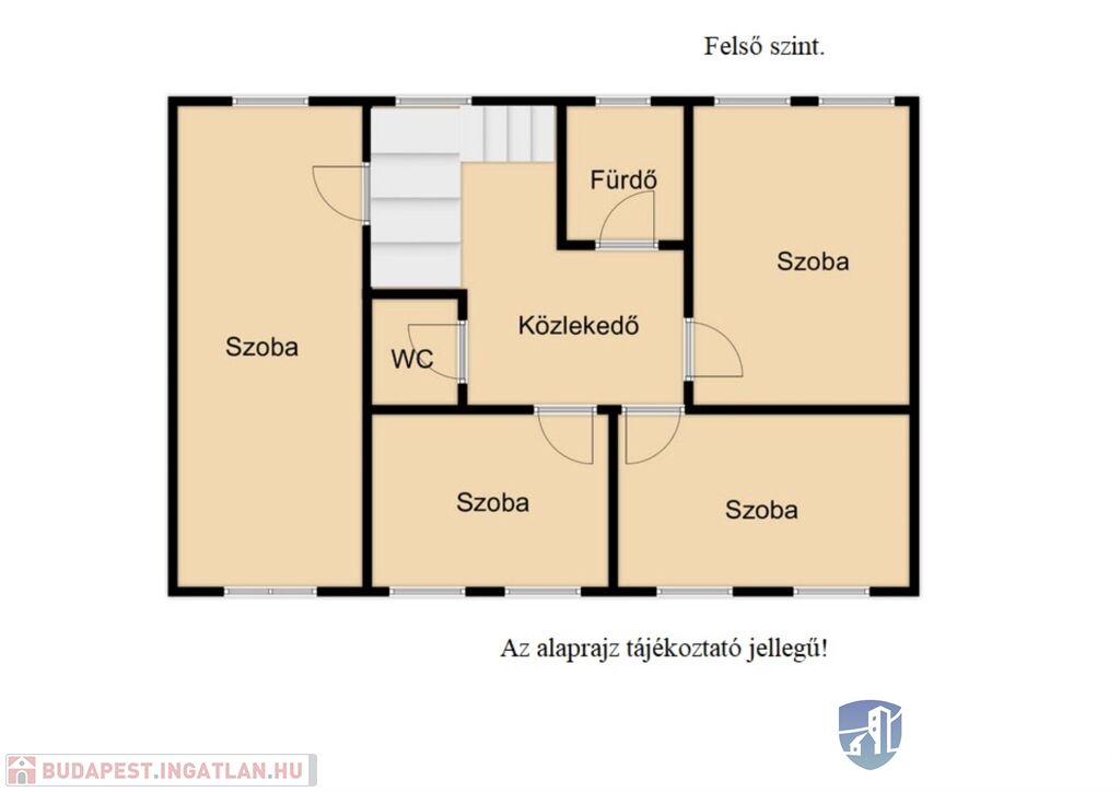 A felső szinten 4 tágas szoba -melyből az egyik külön légterű, különálló fürdő és wc valamint egy közlekedő található.