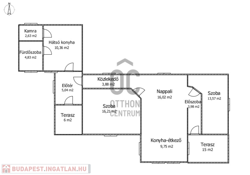 A házban két tágas szoba (16,21 m² és 13,57 m²), valamint egy nagy, világos, 25,77 m²-es konyha–étkező–nappali került kialakításra. Emellett található egy hátsó konyha (10,36 m²), fürdőszoba (4,83 m²) és kamra is, így a helyiségek elrendezése rendkívül praktikus.