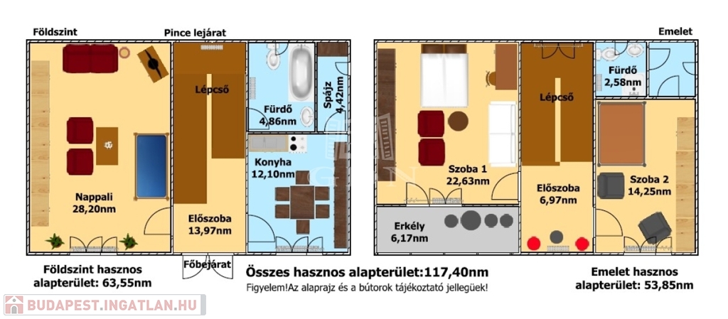A főépület hasznos alapterülete 63,55+53,85= 117,40nm, melyben található: