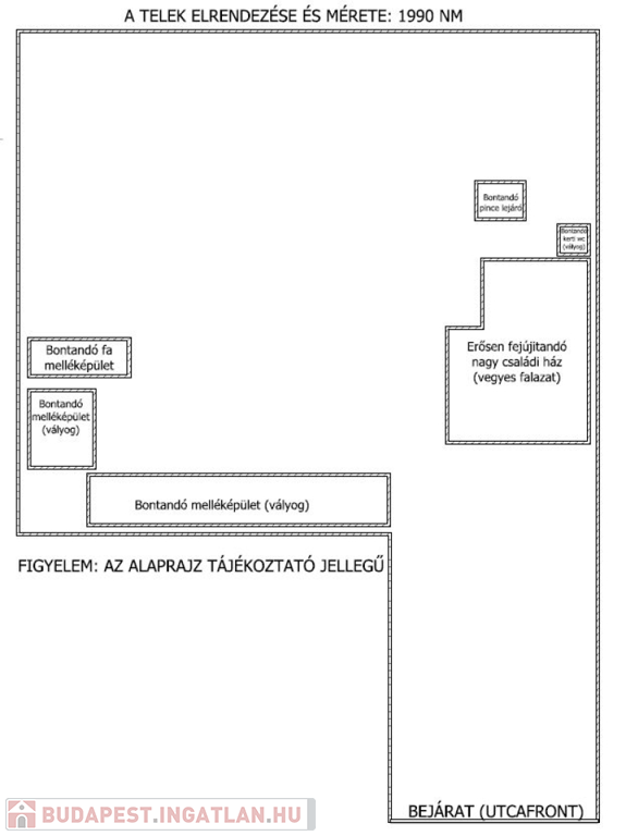A ház állapotából adódóan erősen felújítandó vagy bontandó. Viszont ne feledjük, hogy egy nagy telek áll rendelkezésünkre, ahol a 35 % beépíthetőségi szabálynak köszönhetően megvalósíthatja álmait. Ha több család vagy generáció szeretne ide költözni, akkor a hely mérete bőven engedi ezt (akár ikerház is építhető).