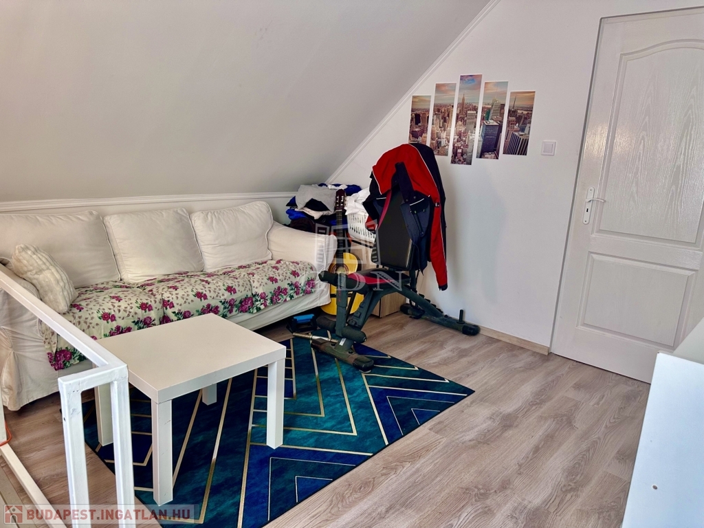 Az első lakrészbe belépve egy tágas, beépített konyhabútoros konyha étkezővel fogad minket! Innen nyílik egy wc ami háztartási helyiségként is funkciónál, itt található a mosógép, valamint egy korszerű bojler is. Ebből a helyiségből tudunk felmenni a felső szintre. Az emeletre felérve, egy kis nappaliba érkezünk, ahonnan nyílik egy tágas, káddal ellátott fürdőszoba, valamint 2 szoba és egy kis közlekedő. A kisebb szobából egy erkélyre is kiléphetünk.