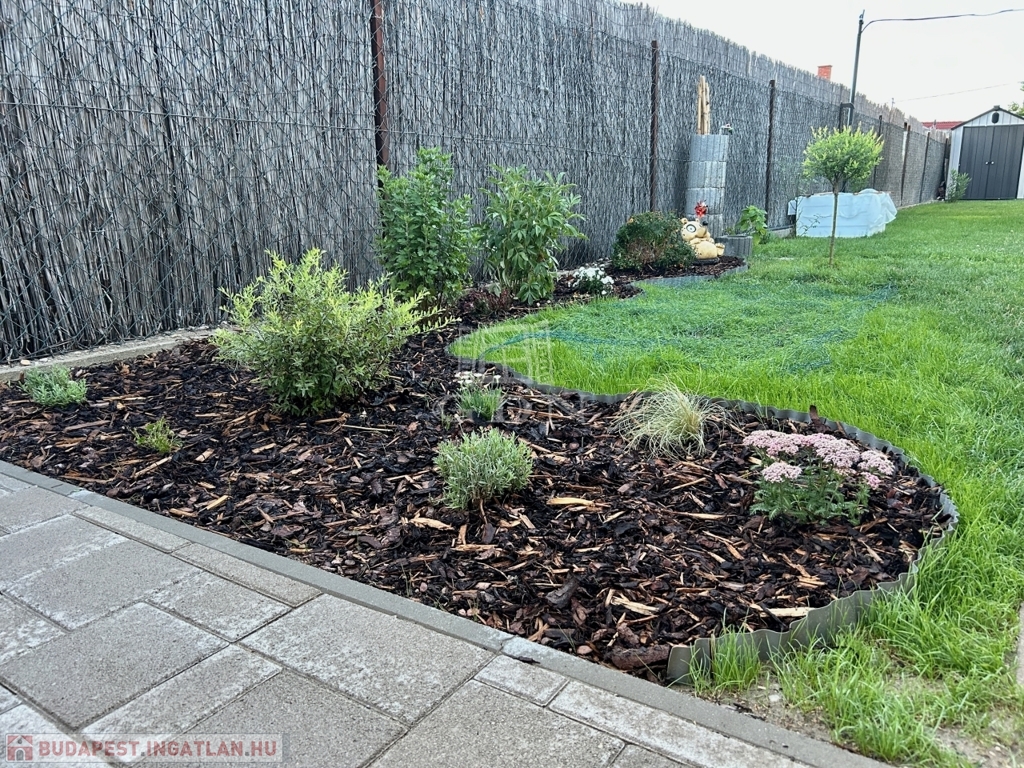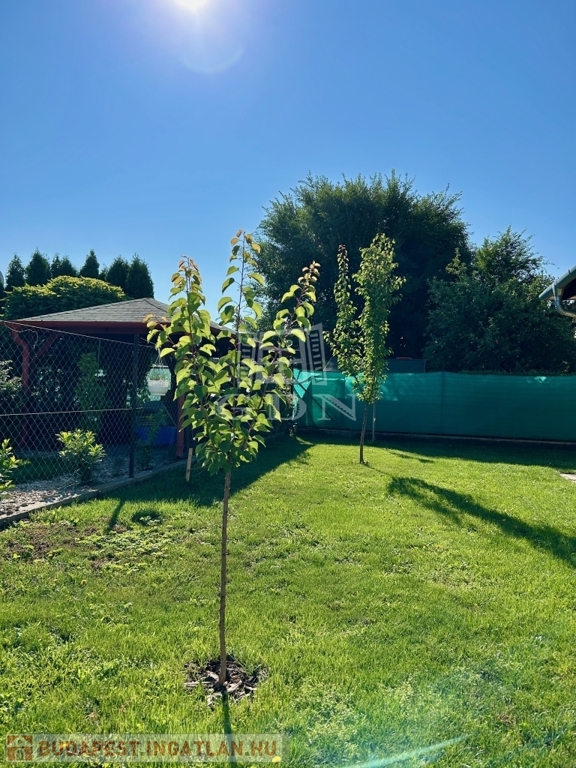 Saját telekrésze 445 m² amely szépen parkosított, 3 db. kocsibeállási lehetőséggel, a kertben található egy kisház is amely kb. 5 m²-es.