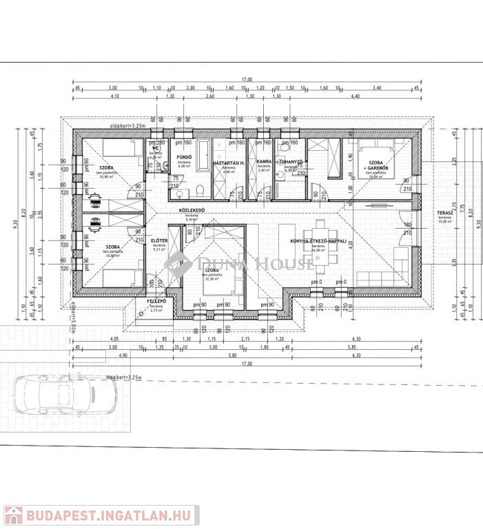 Kialakítása:szoba + gardrób + fürdőszoba, 3 szoba, előtér, nappali+étkező, kamra, háztartási helyiség, fürdőszoba, wc, terasz, fellépő