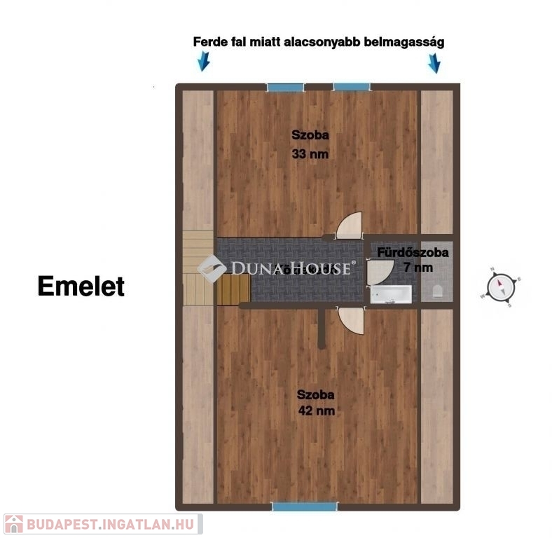 Az emeleti két nagyméretű szoba igény szerint több különálló szobává alakítható