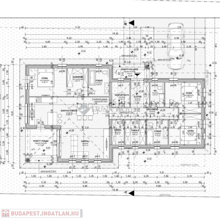 Műszaki paraméterek:Az ingatlan 30 cm vastag porotherm téglafalazatú, 15 cm-es polisztirol szigeteléssel és 30 cm-es födém szigeteléssel készül.Rehau nyílászárók kerülnek beépítésre.A fűtésről kondenzációs kombinált cirkó és padlófűtés gondoskodik, emellett hűtő-fűtő klímával is felszerelt.