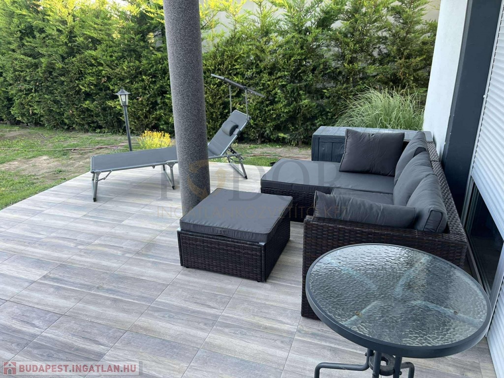 A ház mindkét oldalán autóbeállóval ellátott oldalkert található, az utcafronton rendezett előkert, míg hátul tágas, teljesen intim hátsó kert várja a pihenni vágyókat.