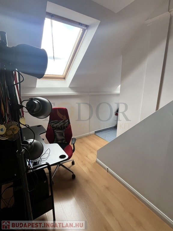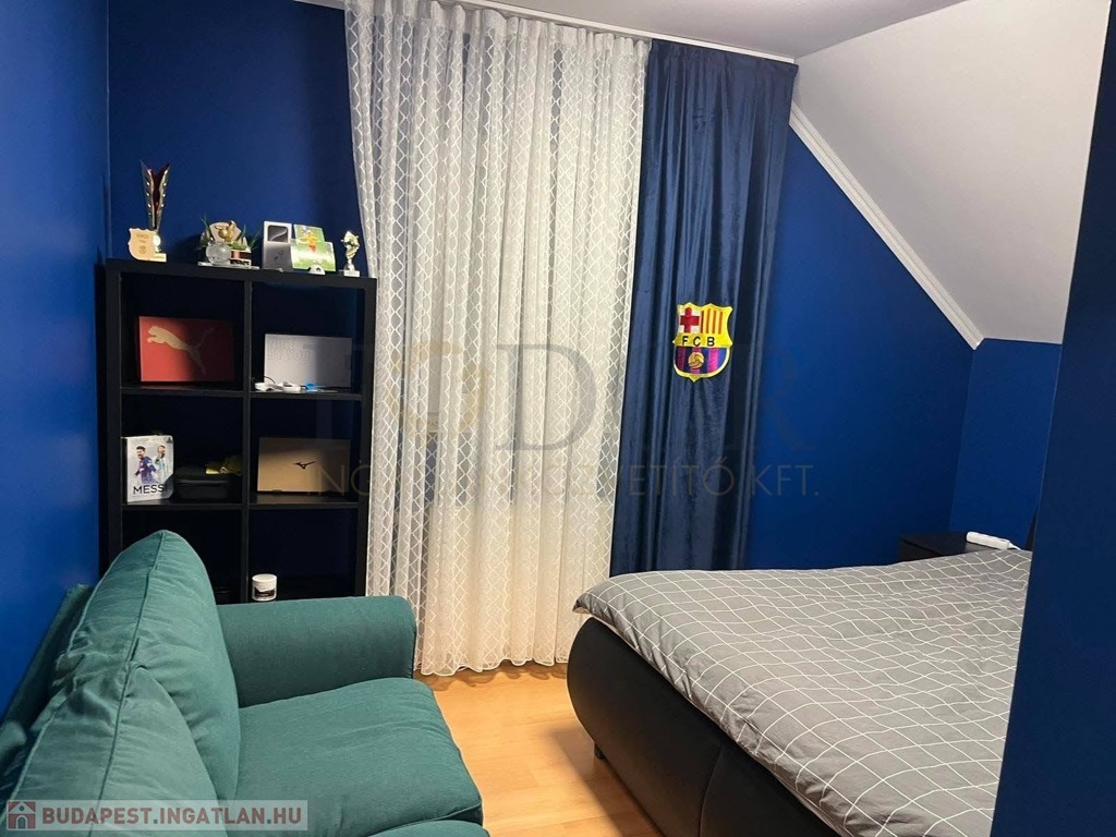 Az emeletre tömörfa lépcső vezet, ahol három hálószoba, egy gardróbszoba, két erkély (egy utcafronti és egy kertre néző), valamint egy nappali pihenősarok kapott helyet. Innen nyílik a beépített tetőtér, amely további szobák kialakítására is alkalmas, jelenleg tárolóként funkcionál.