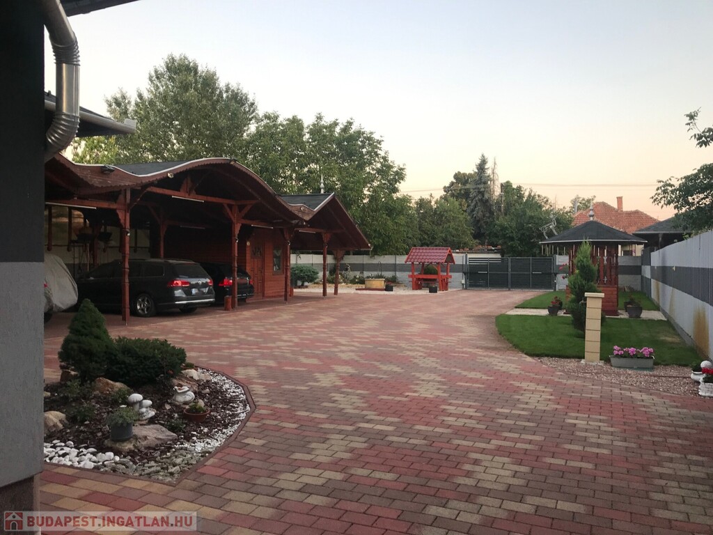Melléképület: 5mx3m-es zárt faház + 3 autó beállására alkalmas fedett szín tegola tetős faszerkezettel