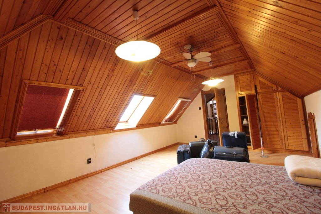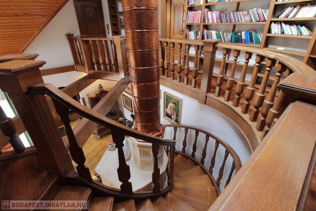 Masszív tölgyfa lépcső vezet az emeleti galériába, ahol egyedi könyvespolcok mellett haladva három szoba, mosókonyha és egy további fürdőszoba (kád, tusoló, WC) található.