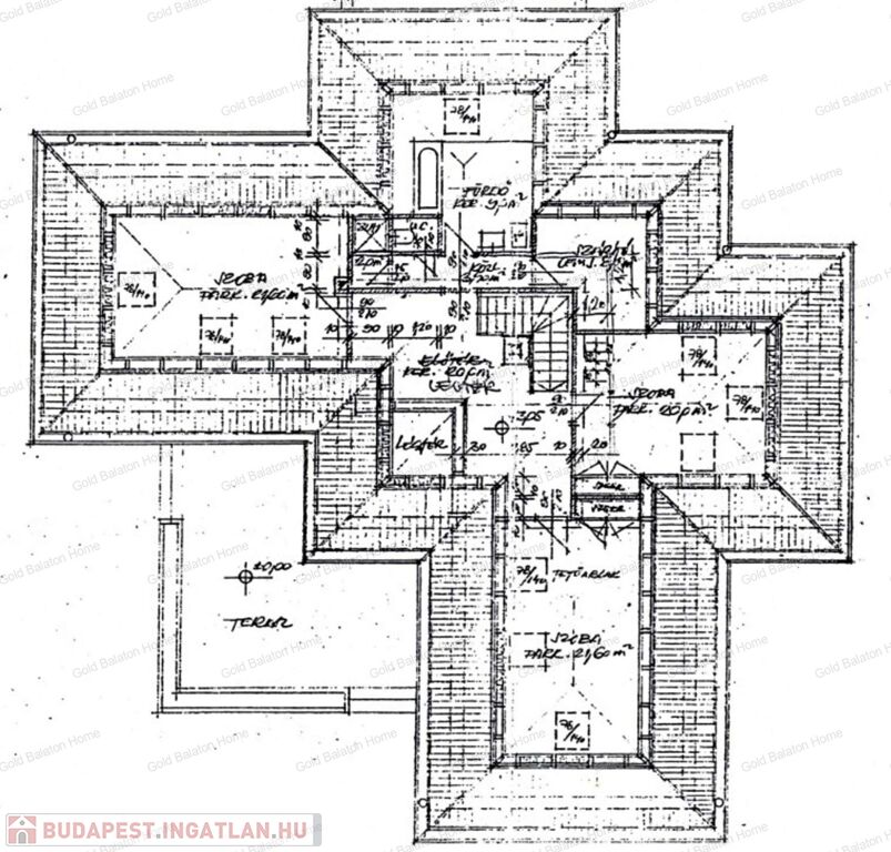 - tetőtér: 3 hálószoba, 1 fürdőszoba zuhannyal, káddal és WC-vel, mosókonyha