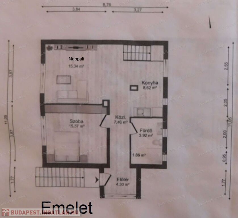 - emelet: előtér, közlekedő, hálószoba, amerikai konyhás nappali-étkező