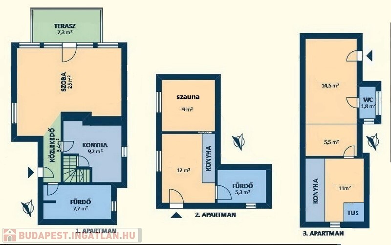 • Alsó szint: Két külön bejáratú apartman, mindegyik saját nappalival, konyhával és fürdőszobával.