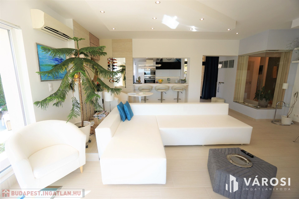 A földszinten található egy amerikai konyhás nappali, egy tágas, részben üvegfallal határolt fürdőszoba, ahol akár a kádból is nézheti a kedvenc filmjét. Továbbá két hálószoba , az egyikből közvetlenül egy panorámás teraszra lehet kilépni.