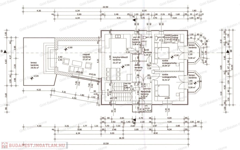 - Emeleti helyiségek: amerikai konyhás nappali 49,94 m2, szoba 16,16 m2, terasz 5,08 m2, szoba 15,54 m2, terasz 5,08 m2, fürdőszoba 6,28 m2, gardrób 1,8 m2, fürdőszoba 2,49 m2, kamra 3,18 m2, előtér 7,56 m2, lépcsőház 6,28 m2, kazánház 1,48 m2, erkély 2,7 m2, terasz 28,56 m2.