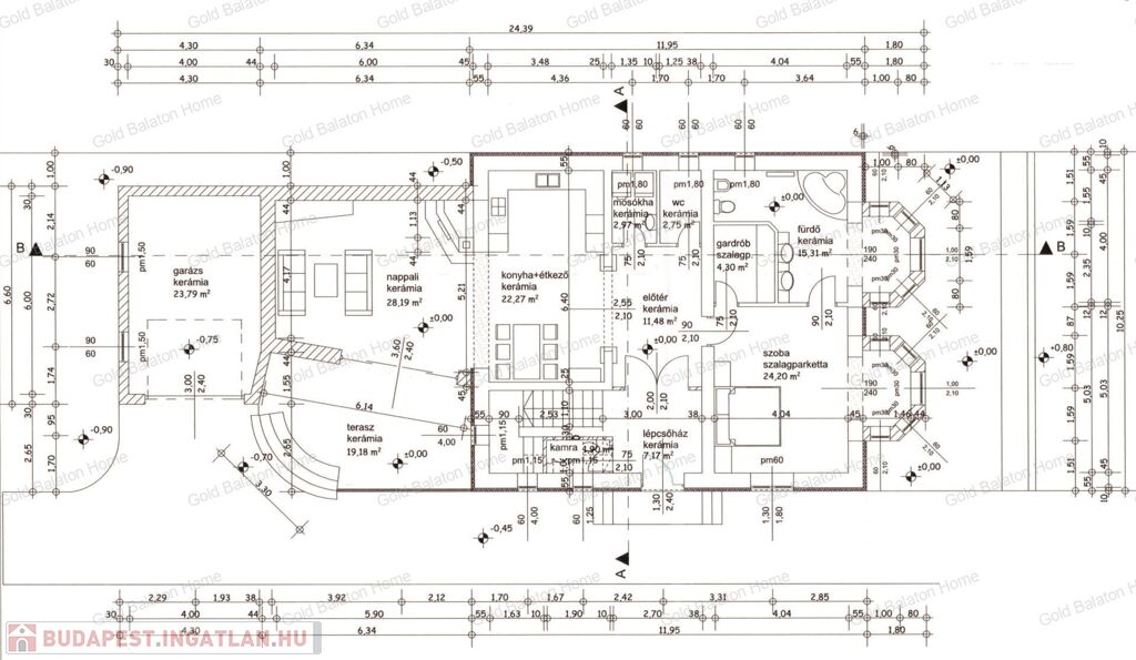 - Földszinti helyiségek: amerikai konyhás nappali 50,46 m2, szoba 24,2 m2, fürdőszoba 15,31 m2, gardrób 4,3 m2, mosókonyha 2,97 m2, külön WC 2,75 m2, kamra 1,9 m2, előtér 11,48 m2, lépcsőház 7,17 m2, terasz 19,18 m2, garázs 23,79 m2.
