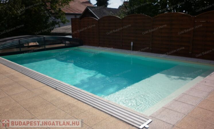 40 m2-es medence napozó terasszal a rendezett udvar ékköve. Fűthető, ellenáramoltatóval, víz forgatóval rendelkezik a gépészet.