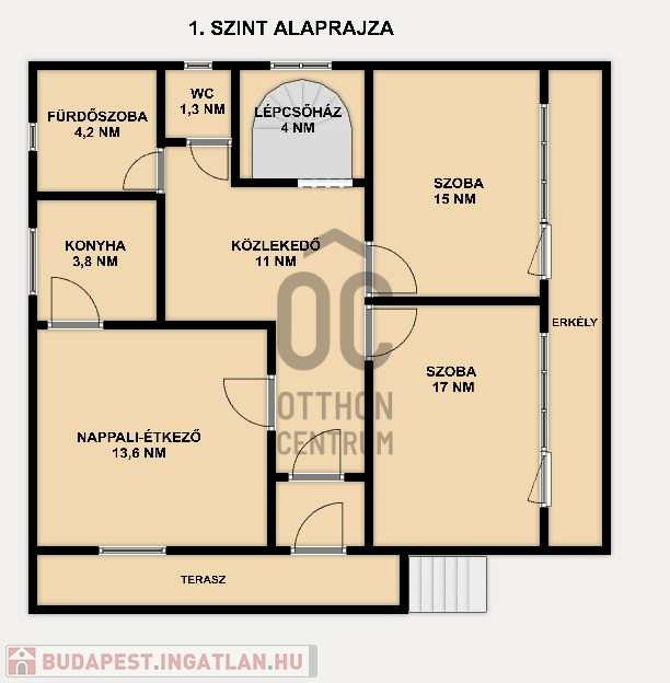 - 1. szint: 2 szoba, nappali-étkező, konyha, közlekedő, fürdőszoba, WC, lépcsőház, erkély összesen 70 nm hasznos alapterületű
