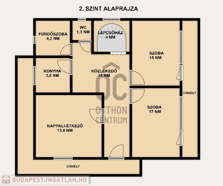 - 2. szint: 2 szoba, nappali, konyha, fürdőszoba, WC, erkély összesen 70 nm hasznos alapterületű