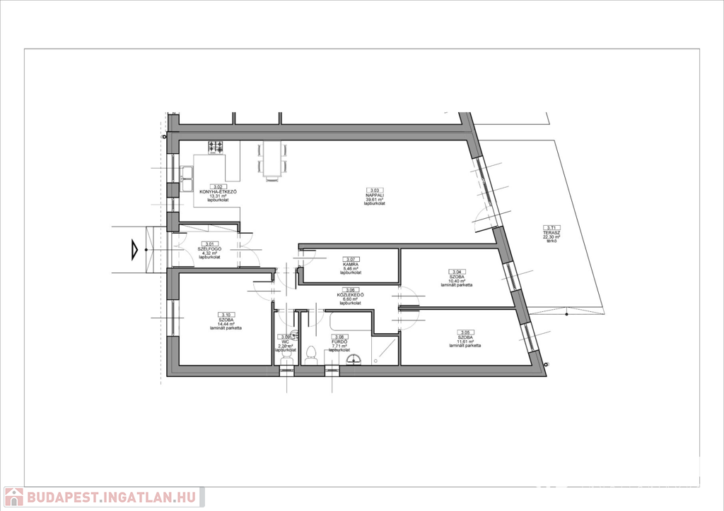 - Szobák: 14,44 m2, 11,61 m2, 10,40 m2