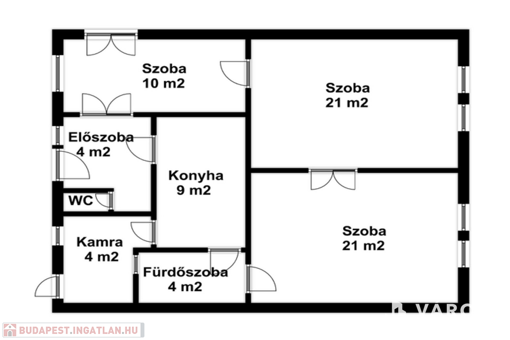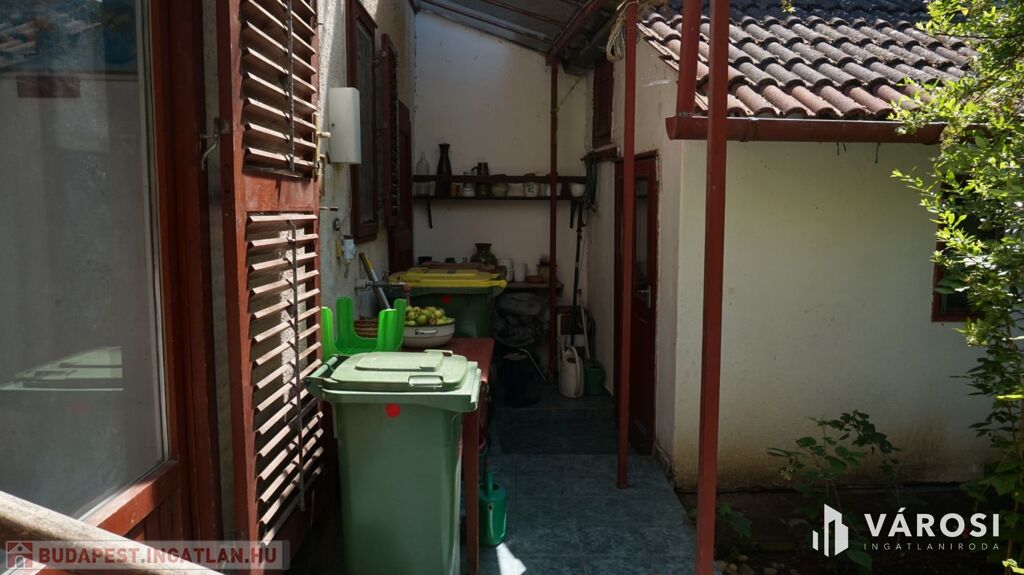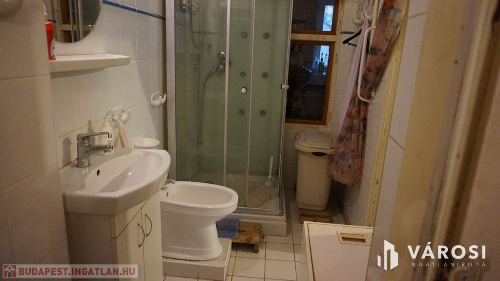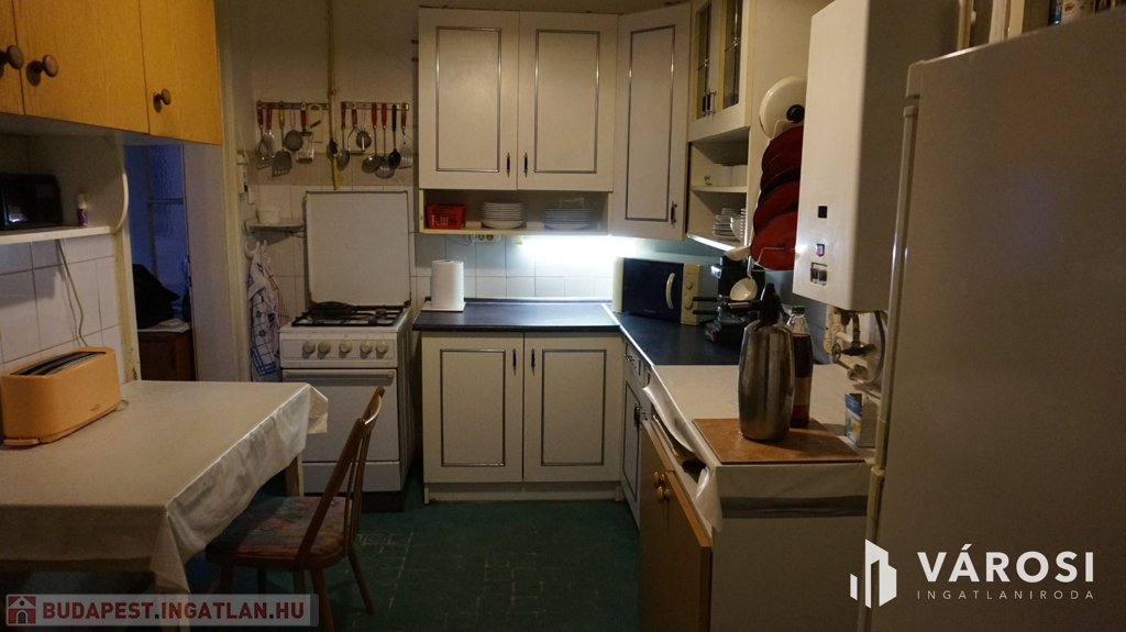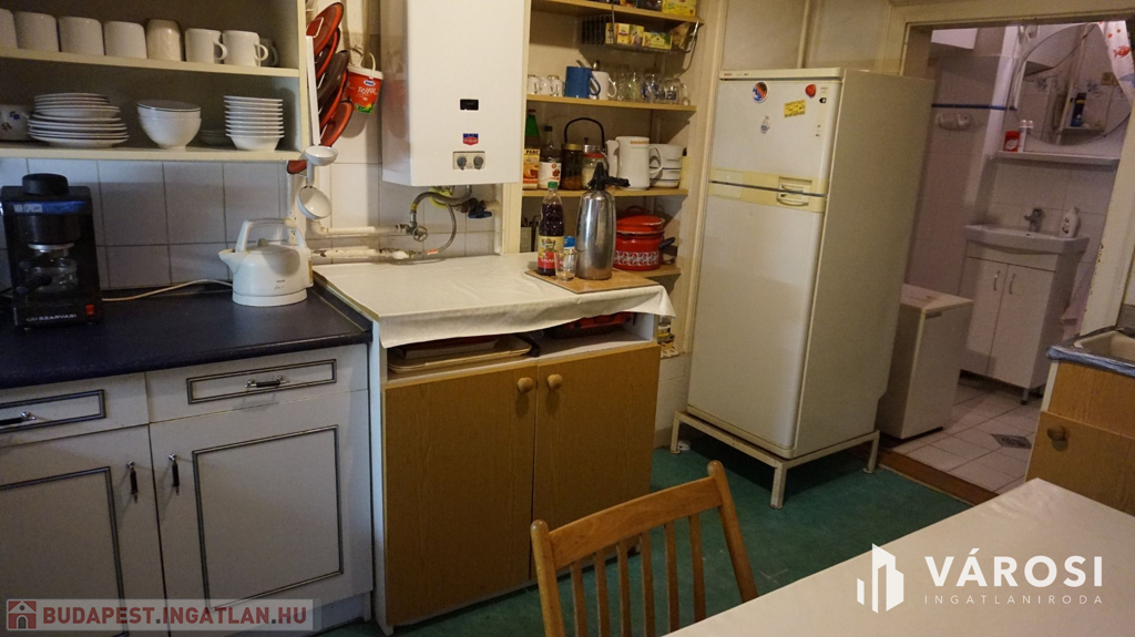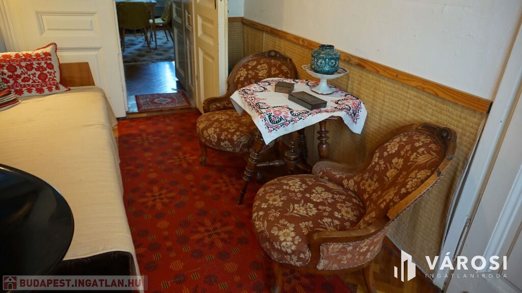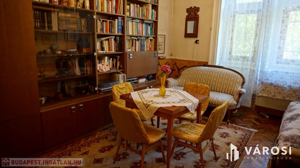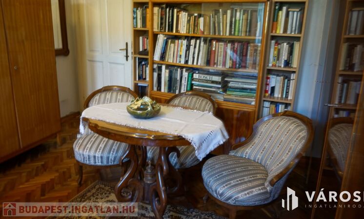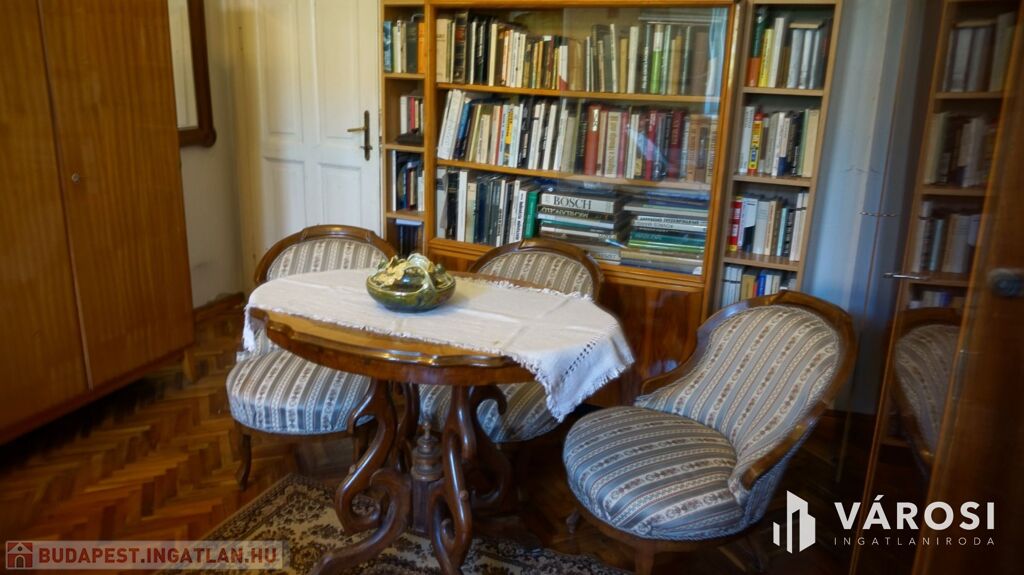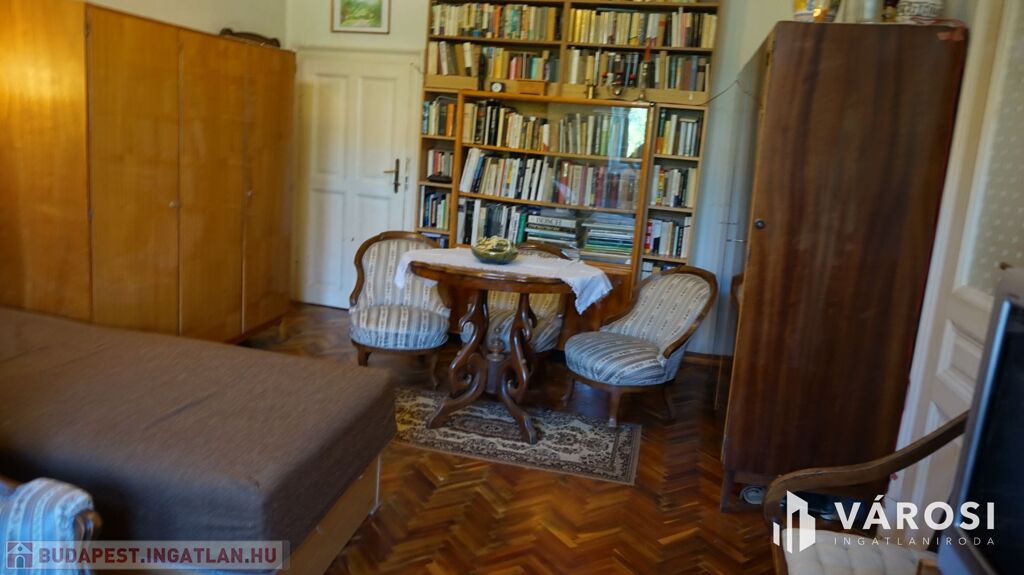 Az egész ingatlant áthatja a polgári életvitelre jellemző berendezés, bútorzat, tágas szobák, a polcokon a temérdek könyv. A lakásnak 2 bejárata van, egyik a kapualjból nyílik, másik a teraszról. A teraszról az előtérbe lépünk először /4 m2/, innen nyílik egy 10 m2-es szoba és a konyha /9 m2/, valamint a toalett /1 m2/. Az egész lakás körbejárható: a kisszobából tovább haladva a két 21 m2-es egymásba nyíló utcai szobába jutunk. A belső szobából nyílik a 4 m2-es fürdőszoba tusolóval és bidével, ami a konyhából is megközelíthető. Ill van egy 4 m2-es kamra, amely szintén a konyhából nyílik. Fűtése gázkonvektoros, a melegvizet átfolyós vízmelegítő szolgáltatja. Kisebb felújításokat végeztek az ingatlanon az utóbbi években, ekkor készült el a fürdőszoba, az utcai fal vízszigetelése, a kapualj hőszigetelése, ill az utcai ablakok cseréje. Viszont egy átfogó felújítás, korszerűsítés az új tulajdonos feladata lesz. Az ingatlan kiváló elhelyezkedése miatt minden gyorsan elérhető: bölcsőde, óvoda, iskola, buszmegálló, üzletek, éttermek, zöldséges, orvosi rendelő, gyógyszertár.